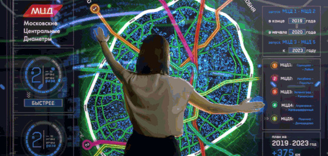 宣傳片中,通過AR增強技術、隔空全息、動畫技術等數字技術,在演示者的講解下將大數據變成3D可視化動態視圖,向觀眾生動直觀的傳達莫斯科交通設施發展的相關數據。